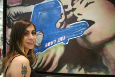 Description of Artwork: Series of sociopolitical satire paintings by the two artists: one depicted a woman seductively placing the muzzle of a gun into another woman's mouth, another portrayed the iconic 'Welcome to Las Vegas' sign as reading "Welcome to Iraq" and dripping with blood.